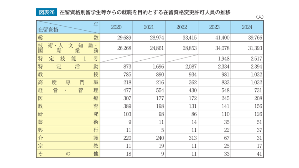 日本の大学・専門学校等で学ぶ外国人は、「留学」の在留資格により在留しています。卒業後日本の企業等への就職を目的として引き続き在留を希望する外国人留学生も少なくありません。 2024年に就職を目的として在留資格変更が許可された数は3万9,766人となっています。